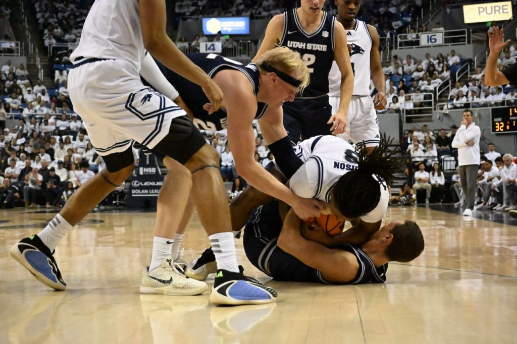 The momentum swung in Nevada’s favor at the four-minute mark when Utah State’s Mason Falslev missed both free throw attempts, and Nevada guard Tyler Rolison and forward Kaleb Lowery made back to back layups. 71-69 Utah State with 3:46 to go.